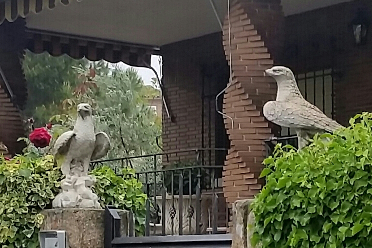 I’m not sure if these are eagles, falcons, or hawks, are you? They certainly look like birds of prey, at least they’re looking away from the house, but I’m not sure they’re very welcoming for visitors!