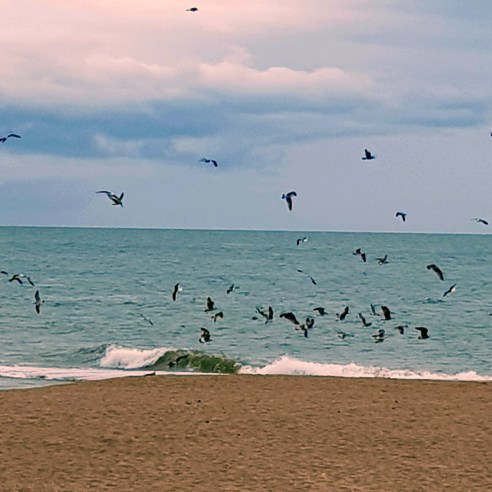 Birds descend on sea-shore