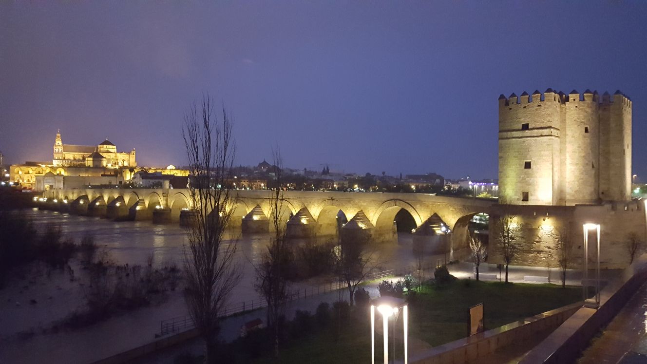 It is a picture of the Roman Bridge in Córdoba, which is illuminated by night. The building at the far end of the bridge is the Mosque, now a Cathedral, which is also lit up at night.