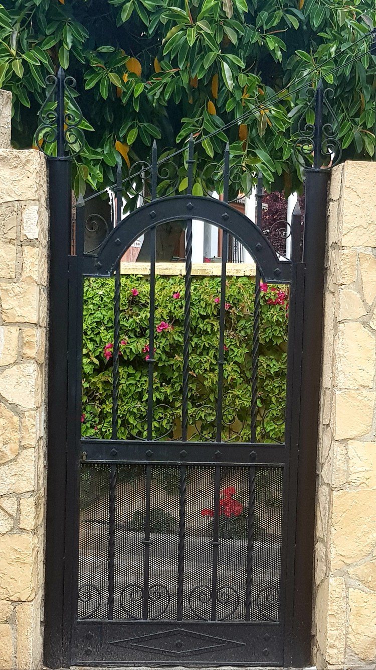Roses peak through iron gate.