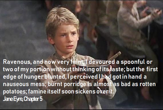 This picture of Oliver Twist asking for more, reminds me of the burnt porridge Jane Eyre had to eat on her first day at Lowood. Jane is the female equivalent of Oliver (published by Charles Dickens about ten years before Jane Eyre).