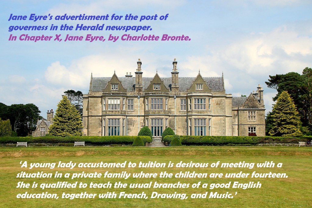 ‘If J.E., is in a position to give satisfactory references as to character and competency, a situation can be offered her where there is but one pupil, a little girl, under ten years of age; and where the salary is thirty pounds per annum. J.E. is requested to send references, name, address, and all particulars to the direction:-‘Mrs. Fairfax, Thornfield, near Millcote.’