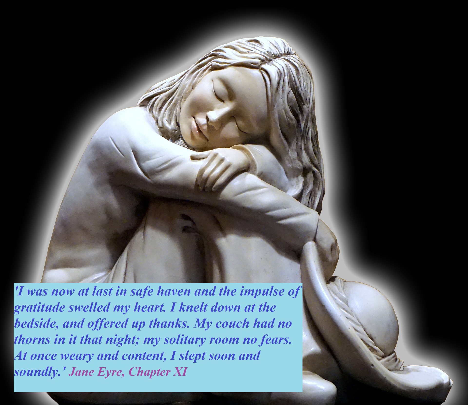 I was now at last in safe haven, and the impulse of gratitude swelled my heart. I knelt down at the bedside and offered up thanks. My couch had no thorns in it that night; my solitary room, no fears. At once weary and content, I slept soon and soundly.