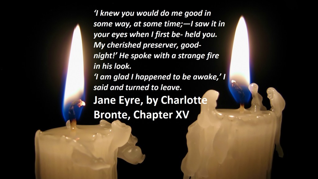 Shortly after the peculiar events, Jane investigates and finds Mr Rochester’s bed is on fire. This event marks a major turning point in their relationship. They share a secret (he is adamant no-one should know what happened, although the servants will undoubtedly see the evidence the following day). He realises he is indebted to Jane and confirms his attraction to her by his physical contact (he won’t let go of her hand) and grateful words and gestures.