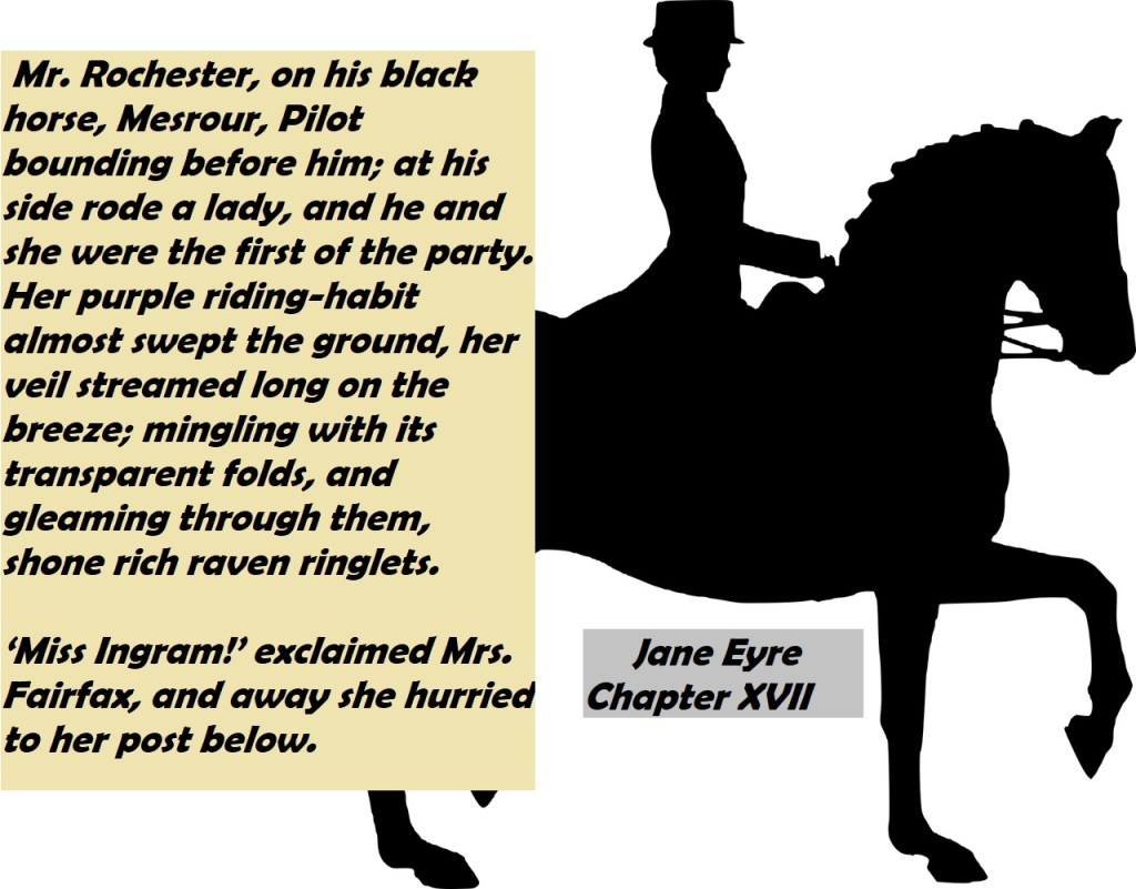 At last wheels were heard; four equestrians galloped up the drive, and after them came two open carriages. Fluttering veils and waving plumes filled the vehicles; two of the cavaliers were young, dashing-looking gentlemen; the third was Mr. Rochester, on his black horse, Mesrour, Pilot bounding before him; at his side rode a lady, and he and she were the first of the party. Her purple riding-habit almost swept the ground, her veil streamed long on the breeze; mingling with its transparent folds, and gleaming through them, shone rich raven ringlets.