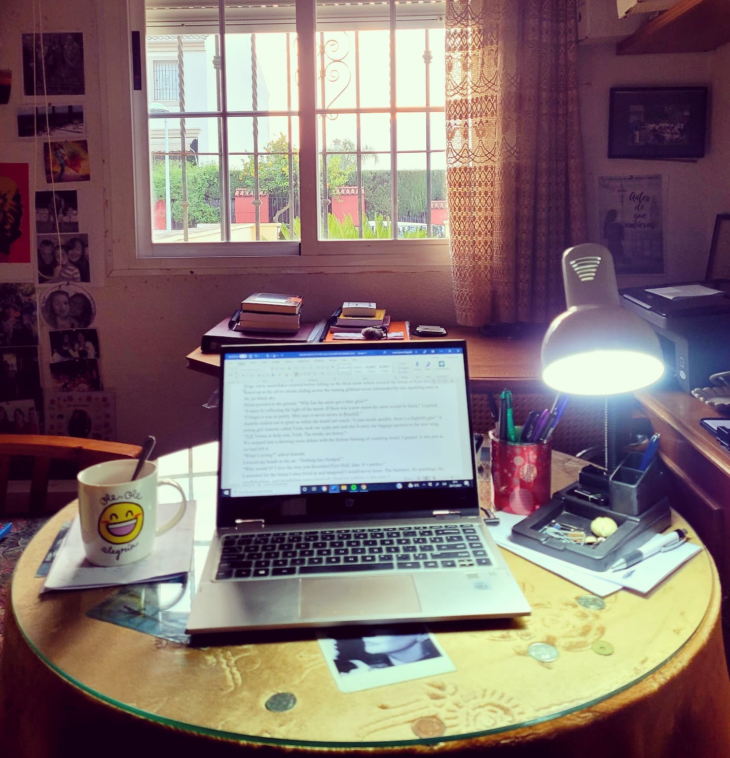 8 am at my writing desk, in my tiny study with my three basic tools, my tea, my laptop and my creativity!