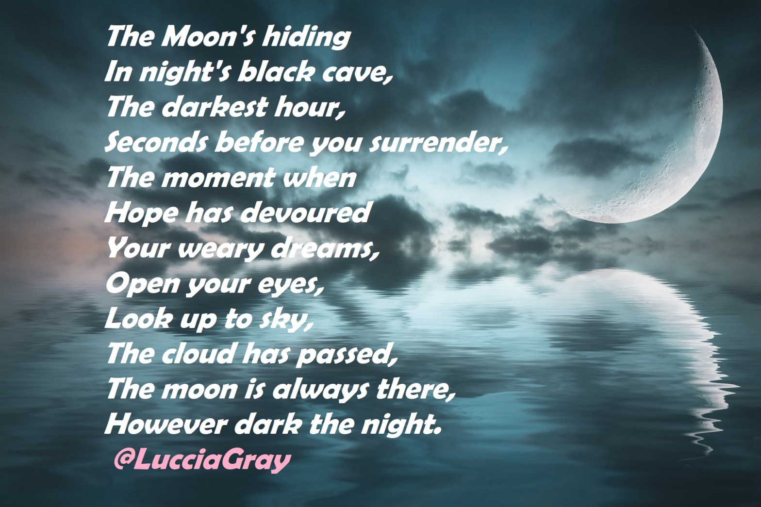 Today’s just one of those days… The Moon’s hiding In night’s black cave, The darkest hour, Seconds before You surrender, The moment when Hope has devoured Your weary dreams, Open your eyes, Look up to sky, The cloud has passed, The moon is always there, However dark the night. @LucciaGray Being almost 62, I’ve hadContinue reading “#ThursdayPhotoThoughts ‘5 Steps to Writing a Poem’ #March2021 @Pixabay #Poetry #ThursdayMotivation”